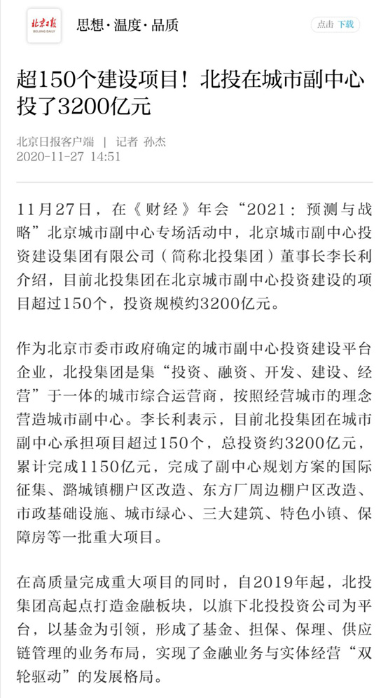 北投集團(tuán)以旗下北投投資公司為平臺(tái),以基金為引領(lǐng),陸續(xù)設(shè)立了北投融資擔(dān)保公司、北投商業(yè)保理公司,并成功收購(gòu)了供應(yīng)鏈管理公司,填補(bǔ)了城市副中心及通州區(qū)相關(guān)行業(yè)領(lǐng)域的空白。截至目前,北投集團(tuán)金融板塊在城市副中心累計(jì)注冊(cè)15家公司,注冊(cè)資金高達(dá)255億元。截至2020年10月底,在通州區(qū)2020年新引進(jìn)企業(yè)稅收中“北投系”企業(yè)貢獻(xiàn)超過(guò)一半。“北投金融系”企業(yè)落戶(hù)城市副中心,將助力副中心打造財(cái)富管理中心和綠色金融中心。