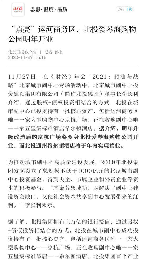 “十四五”時(shí)期,北投集團(tuán)將進(jìn)一步貫徹落實(shí)黨的十九屆五中全會(huì)精神和習(xí)近平總書(shū)記在北京考察時(shí)的重要講話(huà)精神,全面貫徹新發(fā)展理念,全力推動(dòng)城市副中心高質(zhì)量建設(shè)發(fā)展,為將城市副中心打造成為國(guó)際一流的和諧宜居之都示范區(qū)、新型城鎮(zhèn)化示范區(qū)、京津冀區(qū)域協(xié)同發(fā)展示范區(qū),助力通州區(qū)繁榮發(fā)展,作出新的更大貢獻(xiàn)。